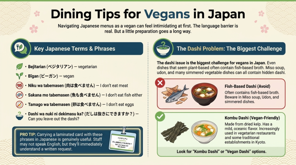 The dashi issue is the biggest challenge for vegans in Japan. Even dishes that seem plant-based often contain fish-based broth. Miso soup, udon, and many simmered vegetable dishes can all contain hidden dashi.