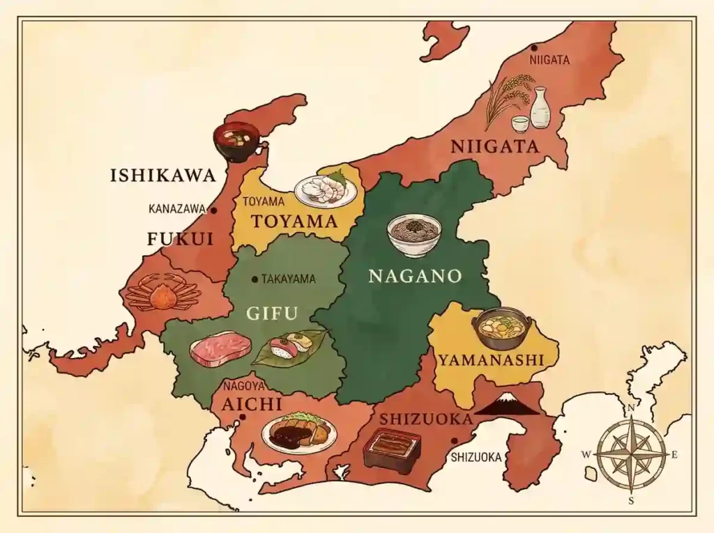 The region produces world-class Hida beef, premium Niigata rice, rich Nagoya miso dishes, and fresh seafood from the Sea of Japan.