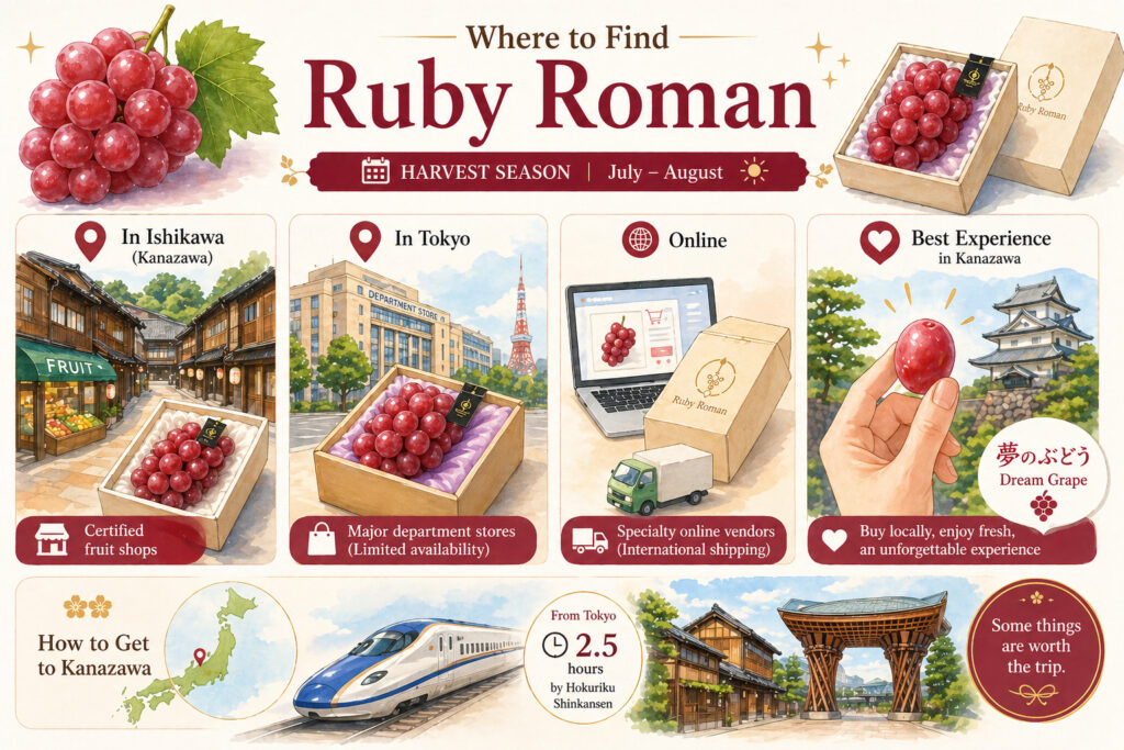 The harvest season runs from July through August. Grapes are sold through certified fruit shops in Ishikawa, particularly in Kanazawa. Major department stores in Tokyo occasionally carry them during peak season. Some specialty online vendors offer shipping to international destinations, though prices reflect both the rarity and the logistics.