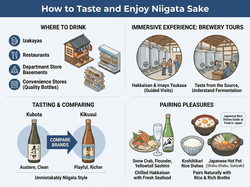 Niigata sake tasting with brewery names as your guide makes comparisons easier. Try a Kubota alongside a Kikusui and notice how they differ. One is more austere, the other more playful. Both are unmistakably Niigata.