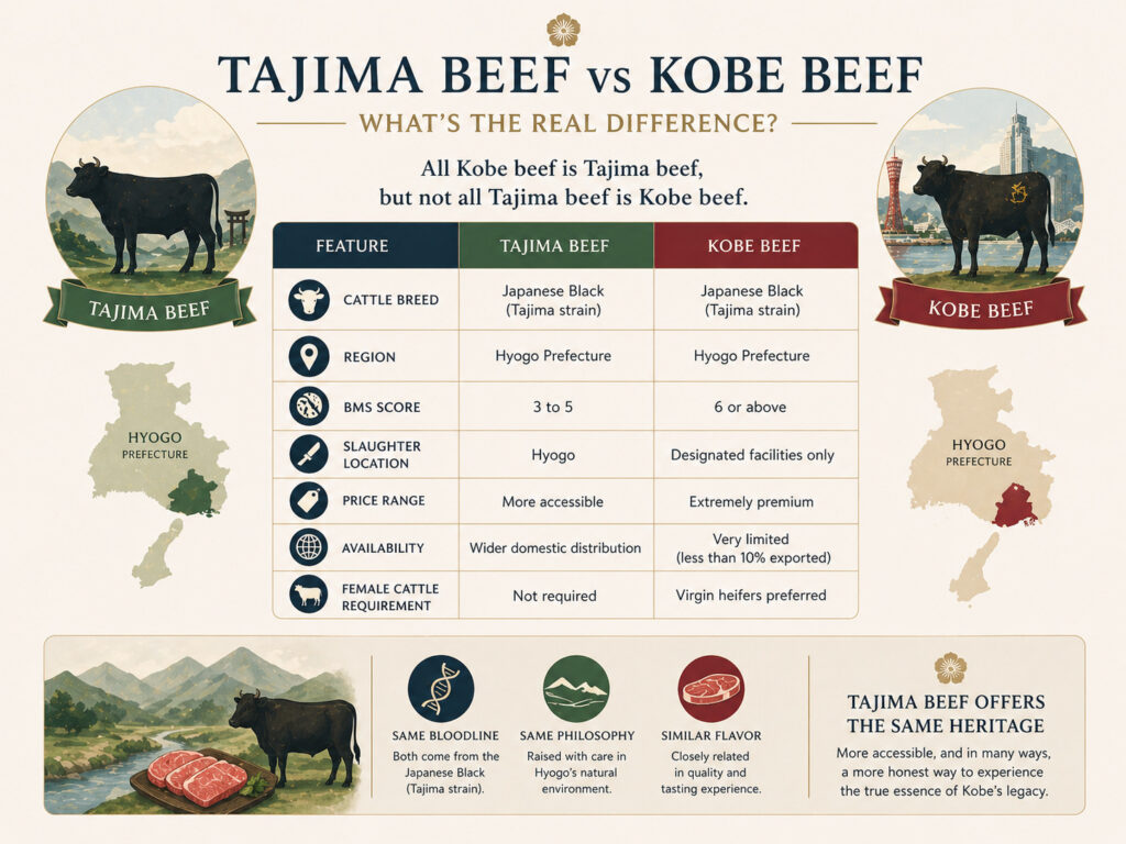 This is the question most people want answered. The short version: all Kobe beef is Tajima beef, but not all Tajima beef is Kobe beef.