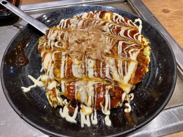 Okonomiyaki is a Japanese savory pancake made with a batter of flour, eggs, and shredded cabbage, and can be customized with a variety of ingredients like pork, seafood, and vegetables, all topped with okonomiyaki sauce and bonito flakes.