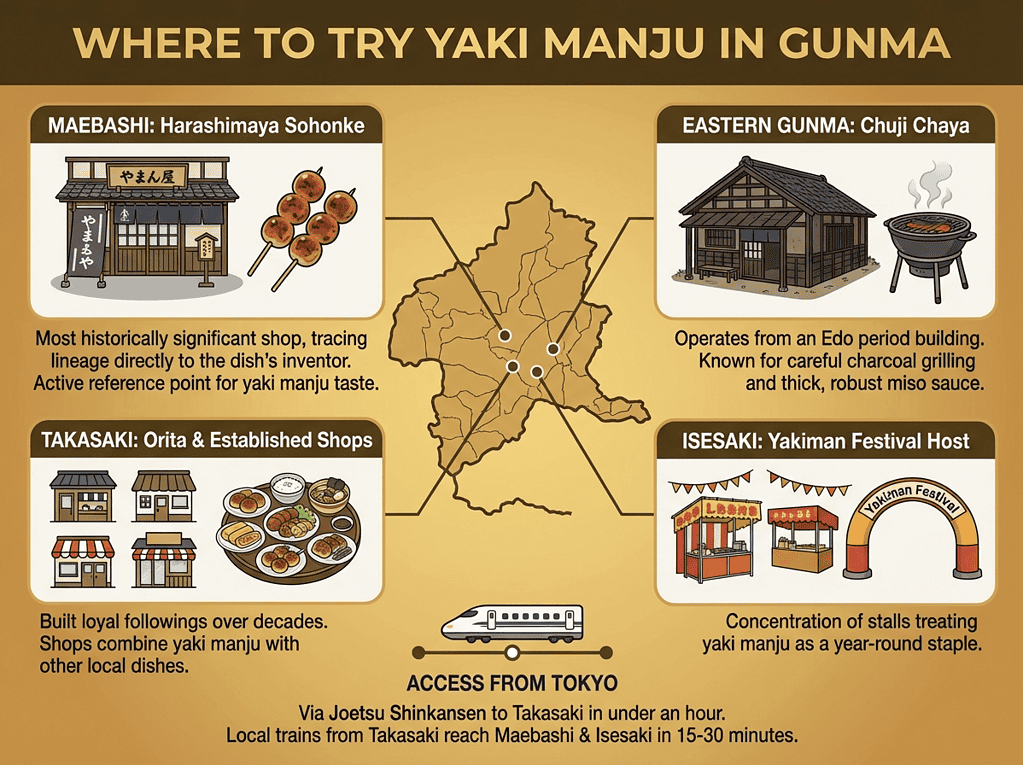 Harashimaya Sohonke in Maebashi is the most historically significant shop, tracing its lineage directly to the dish’s inventor. It remains active, and food lovers widely regard it as the reference point for what yaki manju should taste like.